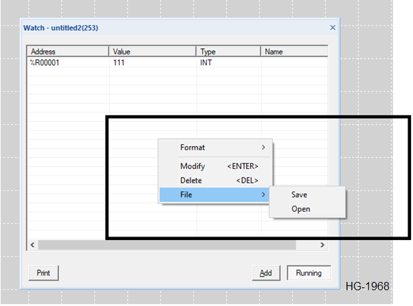 Running - This option indicates that the Data Watch is communicating with the controller and gathering the selected register/variable values. Clicking this button changes the label to Halted, and the Data Watch communications are stopped.